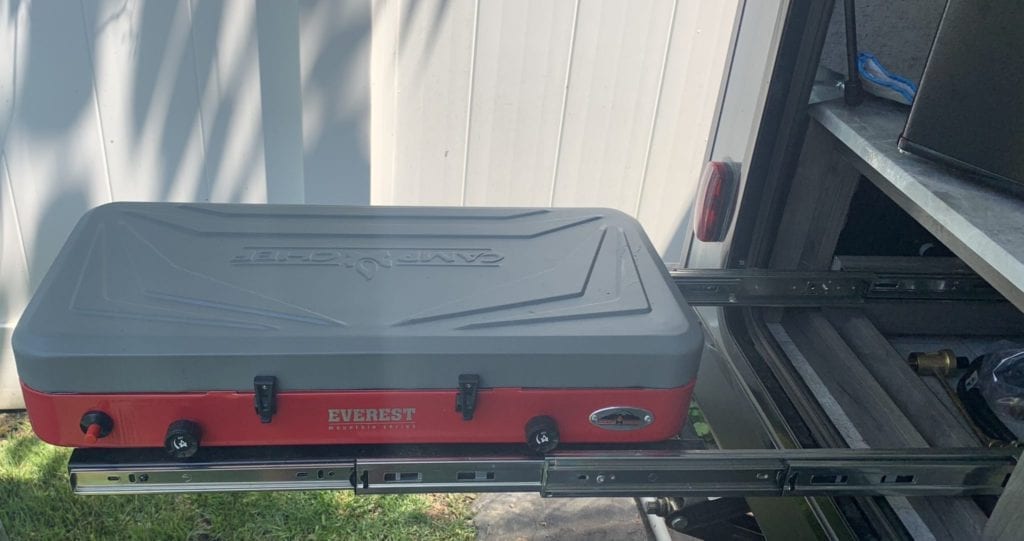 We tried grilling on the Coleman grill that came with the 215RBK with really bad results. Everything stuck to the sheet metal grate and it didn’t get hot enough to do a good job. We’ve been grilling on a Weber Q for years and really like the results. We had bought a camping stove for our prior trailer and it fit where the Coleman was. It didn’t quite fit perfectly however, so we ended up putting two L-brackets underneath to hold it stable. We had seen alternative designs where a tray was put on the slide out rails so an alternative grill like the Q could be placed there, but after a lot of thought we decided that we wanted both a stove and a grill. We went all in and upgraded our Q with the wheeled stand so its easy to setup and tear down. We also decided to stay with the small propane tanks and invested in a pair of refillable ones. We do have a hose adapter for 20 pound tanks and store it underneath the stove slide, but its only just in case.